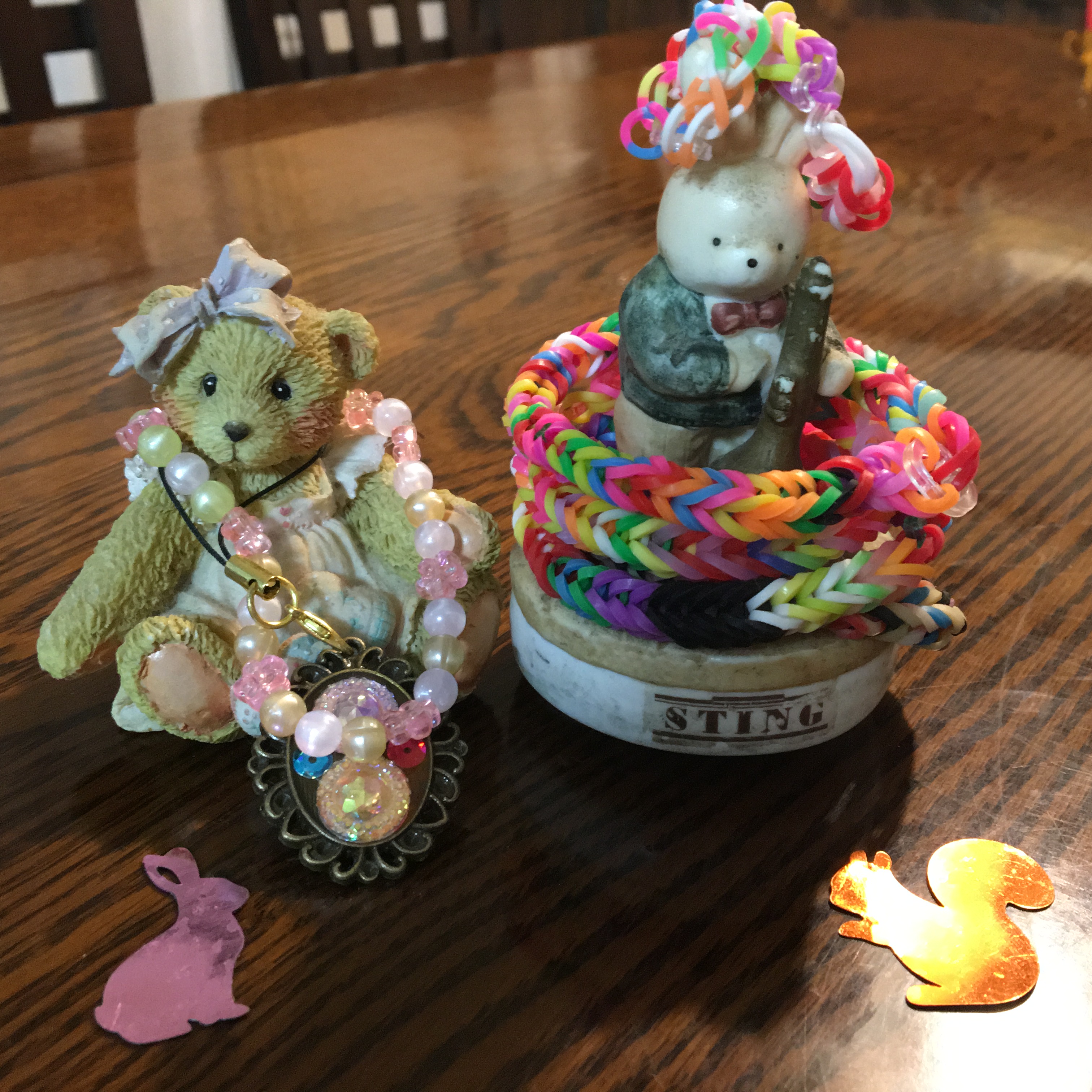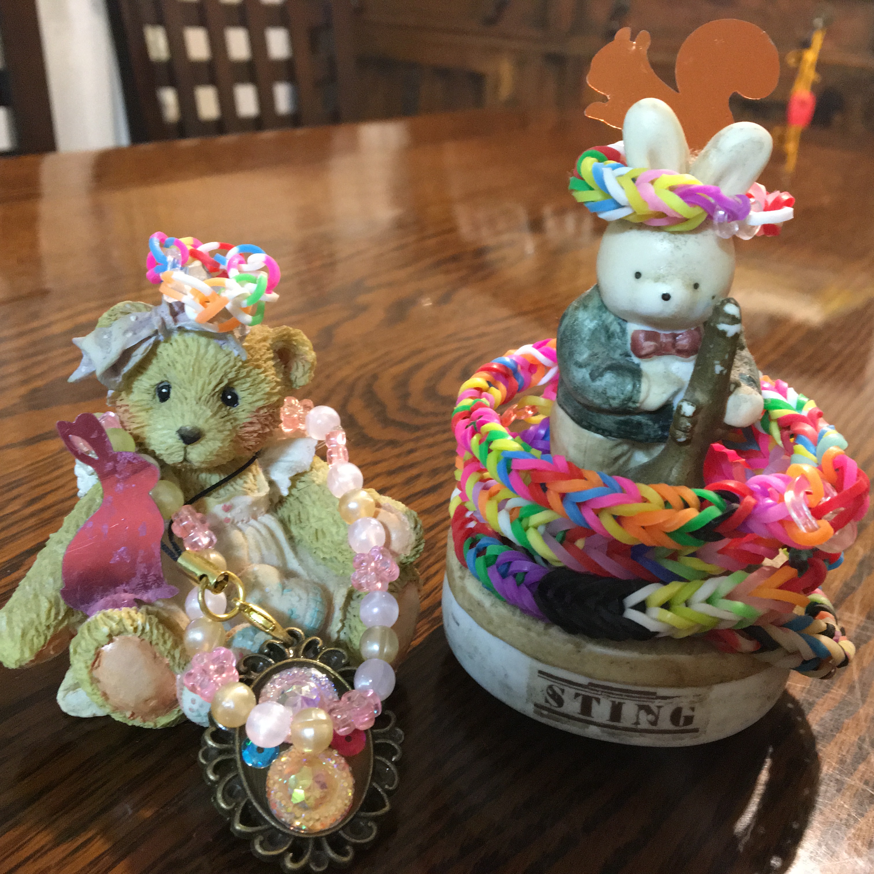レッスン室にかざってある陶器のくまさんとうさぎのオルゴールがおしゃれに変身しています。